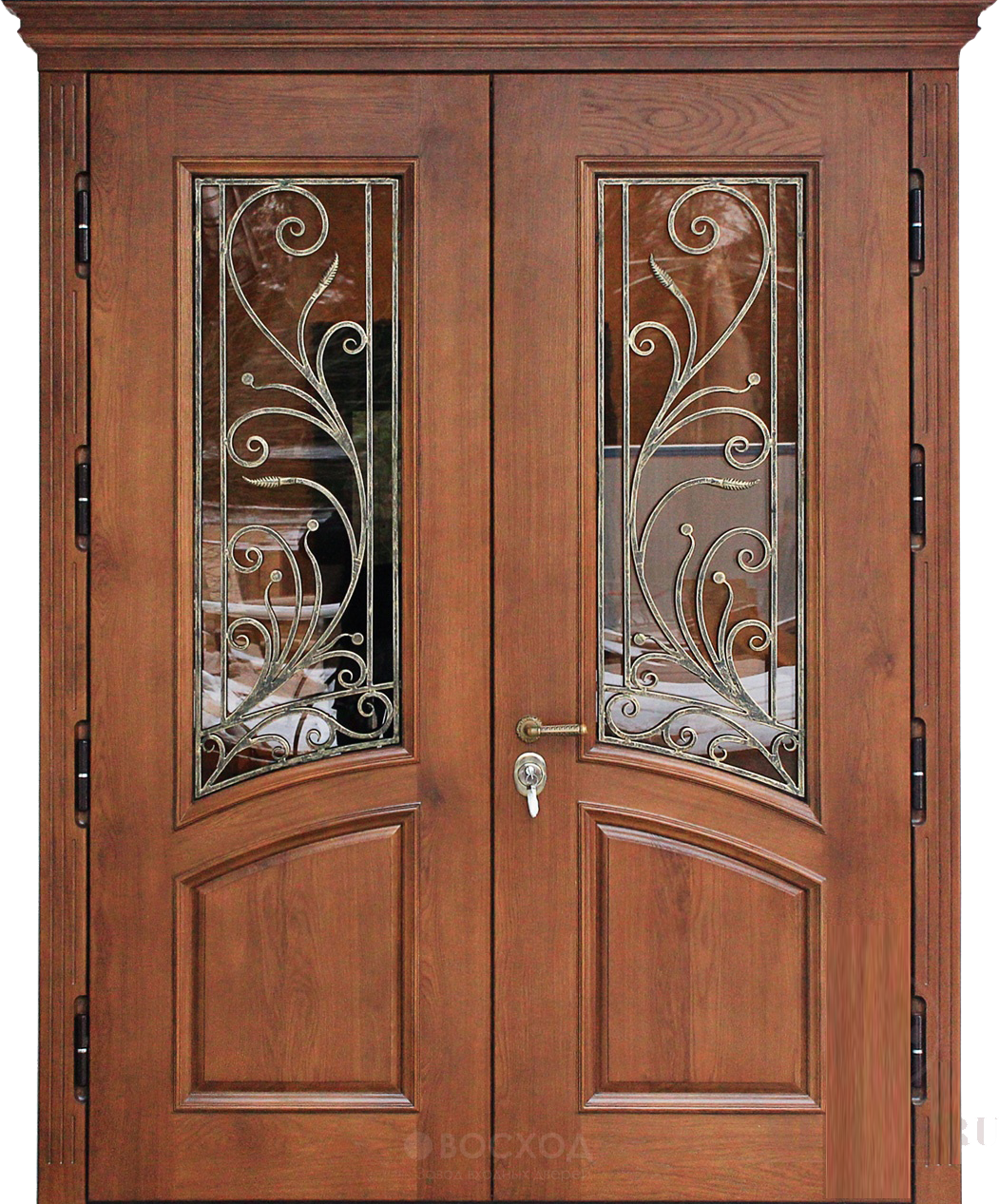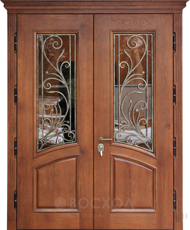 Натуральное дерево в отделке всегда выглядит благородно, особенно если речь идёт о фасаде частного дома или коттеджа. Тёплая текстура панелей сохраняет презентабельный вид долгие годы, устойчива к механическим повреждениям и атмосферным воздействиям, придавая входу в жилище респектабельность и основательность. Двустворчатая входная дверь в дом №330 сочетает солидность деревянной отделки с прочностью металлической конструкции: стальной лист толщиной 2 мм, профильные трубы и рёбра жёсткости формируют надёжный каркас, а блокираторы и два контура уплотнения усиливают защиту и удобство эксплуатации. Для безопасности предусмотрены замки итальянского производства Cisa — цилиндровый и сувальдный, каждый со своей системой ригелей, что гарантирует высокий уровень защиты. Дополнительно доступна шумо- и теплоизоляция, установка зеркала, стеклопакета, ковки или даже видеодомофона, превращая дверь не просто в элемент защиты, а в индивидуальное архитектурное решение.